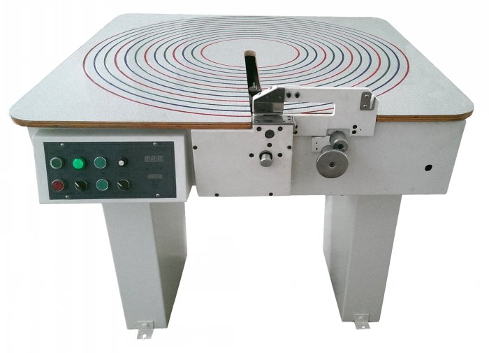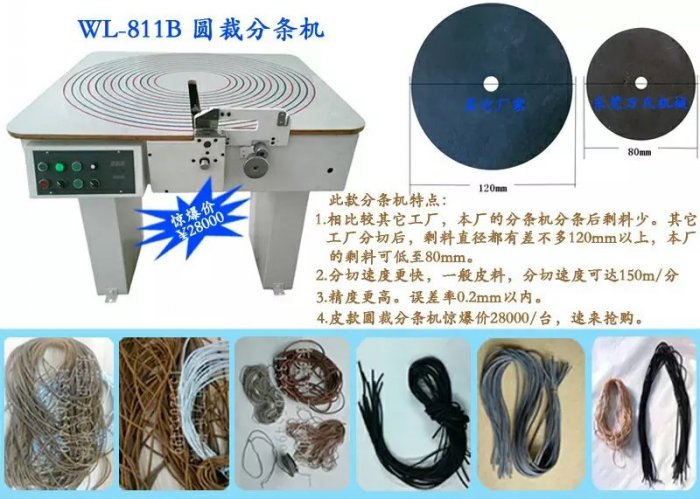 又名圓裁分條機,它適合于大面積(整塊)皮料的分條,有效地節(jié)省材料,可裁出連續(xù)長度達數十米的皮條。通過電腦控制顯示板設置參數,馬達進行無級調速,皮料在臺板上旋轉經過圓刀分條作業(yè),可裁出任意寬度皮條,分條速度高,適用于任何厚度的皮料。